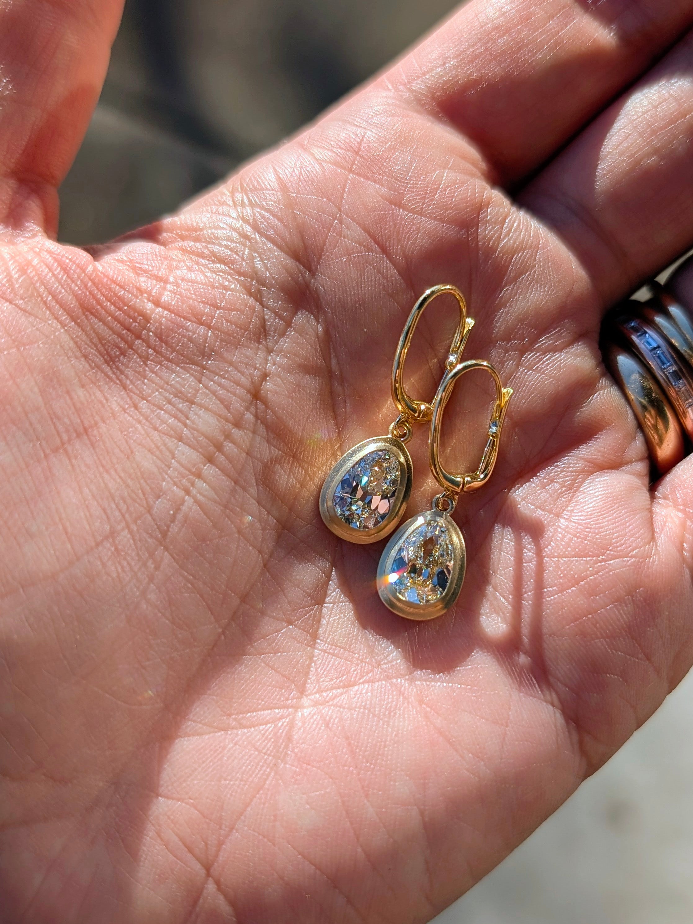 These diamonds will take your breath away. Technically they are pear cuts, but have been shaped with such poetic choices in contour and faceting that they take on an elegant, almost egg-like silhouette. Their warm, natural color is expressive. The cut and polish mesmerizing. Set in a double bezel with a satin finish, the gold introduces a subtle metallic glow amplifying the stones without overshadowing their uniqueness. Three carats of rare character, showcased with purpose.
