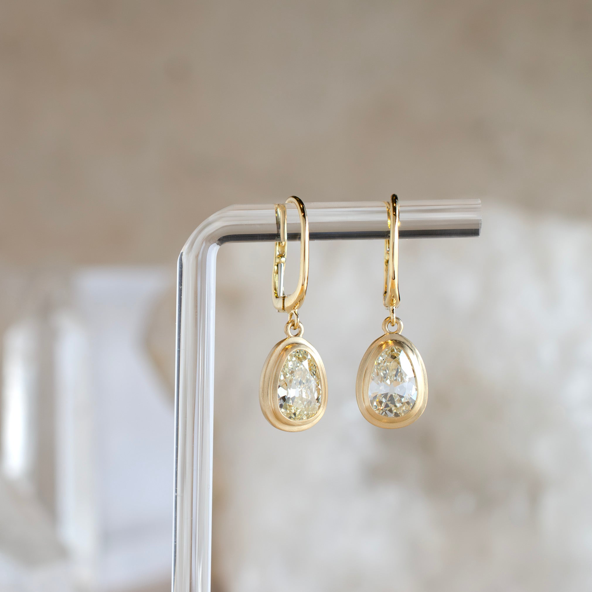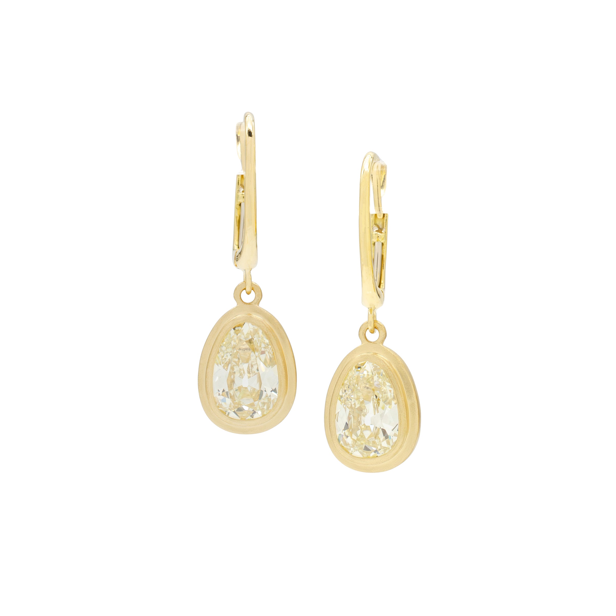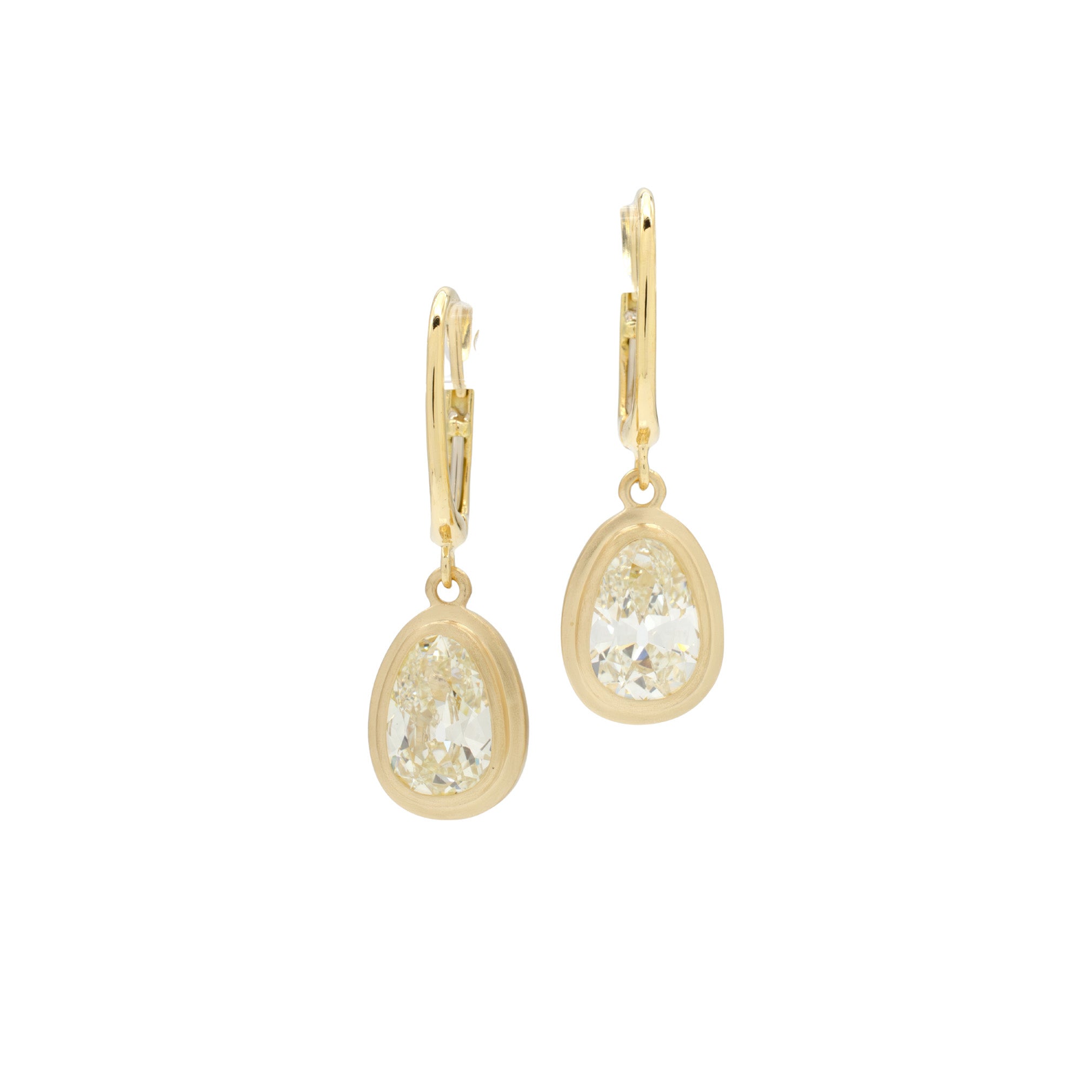 These diamonds will take your breath away. Technically they are pear cuts, but have been shaped with such poetic choices in contour and faceting that they take on an elegant, almost egg-like silhouette.  Their warm, natural color is expressive.  The cut and polish mesmerizing.  Set in a double bezel with a satin finish, the gold introduces a subtle metallic glow amplifying the stones without overshadowing their uniqueness. Three carats of rare character, showcased with purpose.