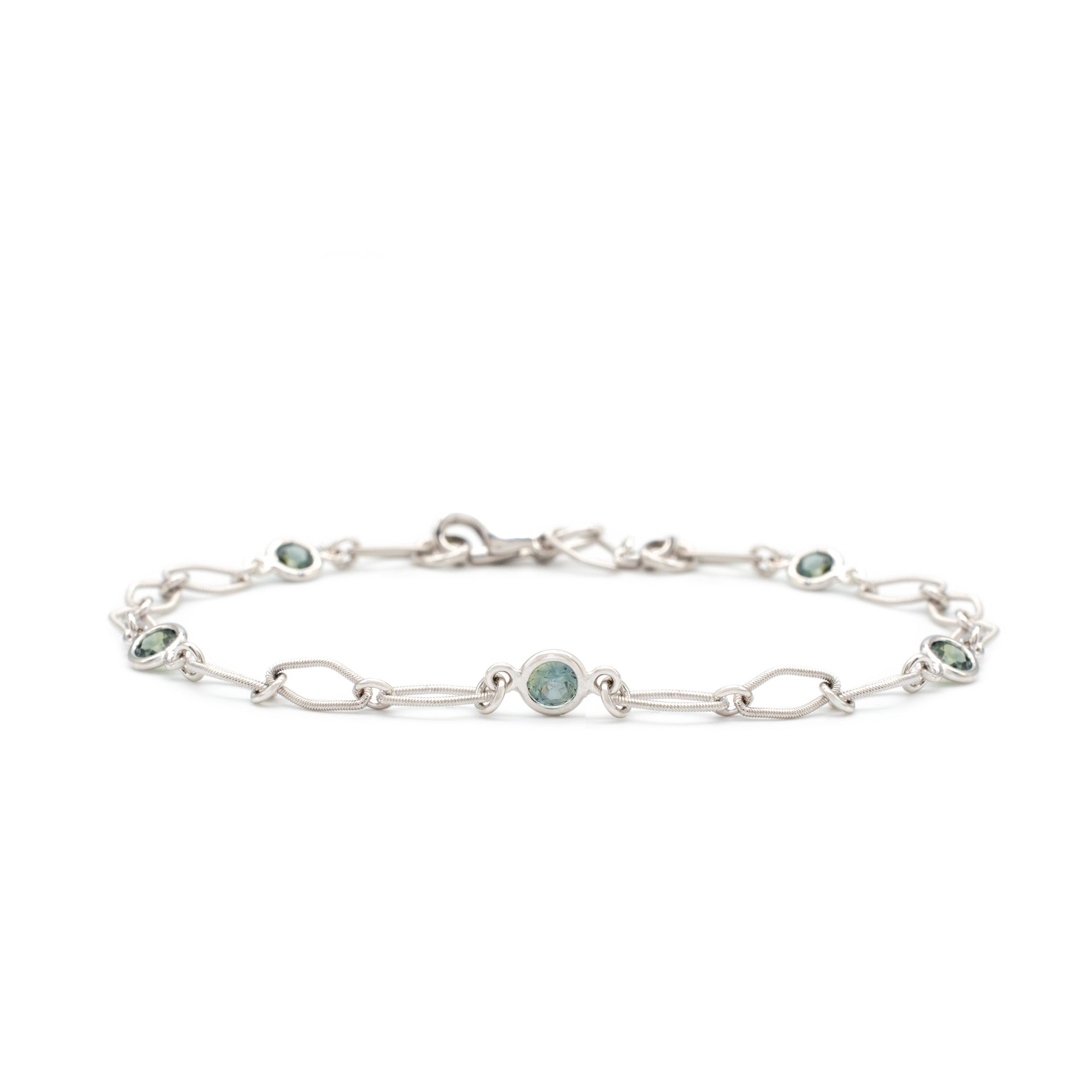 Natural sapphires in shifting tones of pastel teal and blue-green trace a fine line around the wrist, each stone framed by hand formed 18k gold bezels and joined by chain links rolled into shape one by one.
