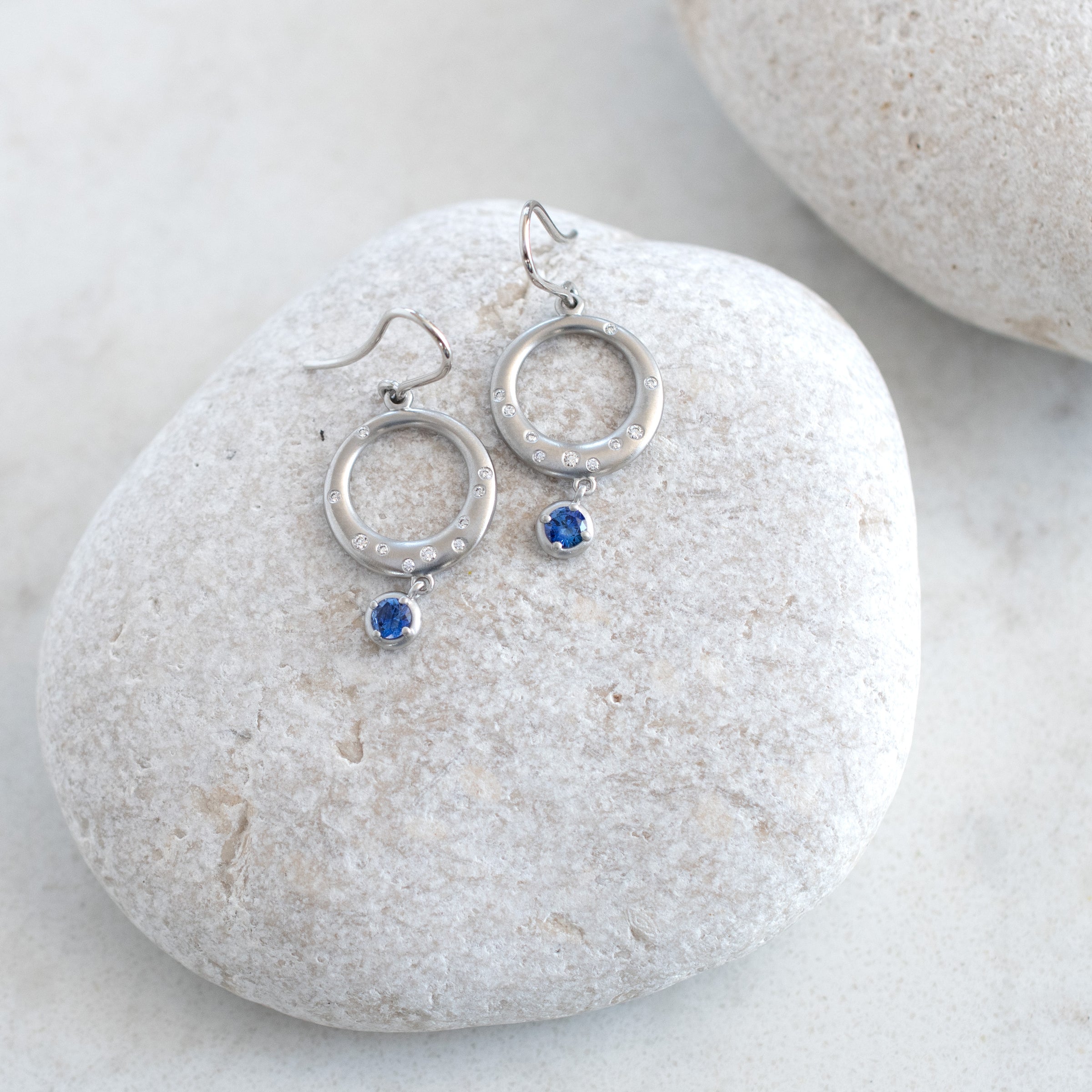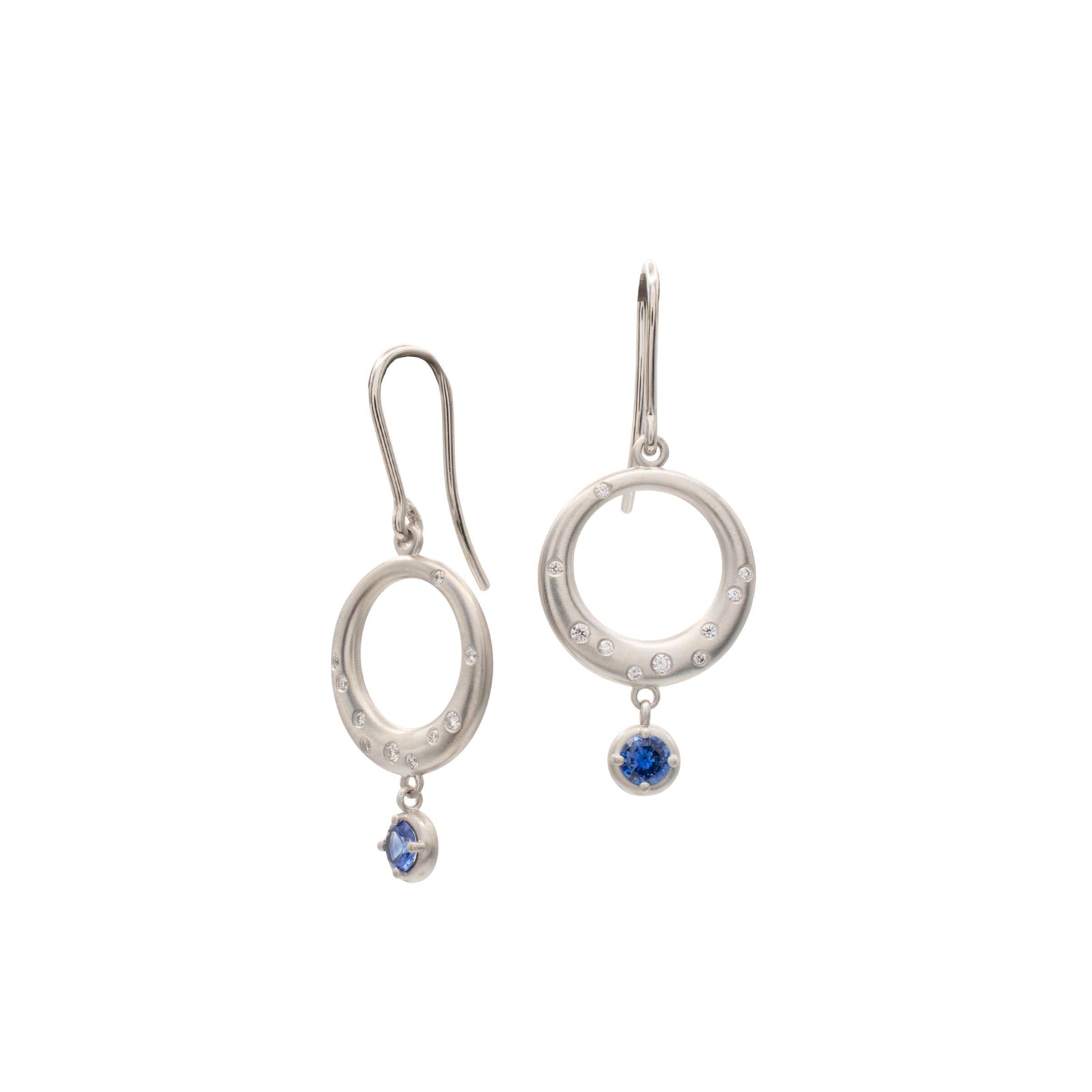 Part of our galaxy series, these easy going earrings feature a smattering of star-like diamonds and beautiful blue sapphires.