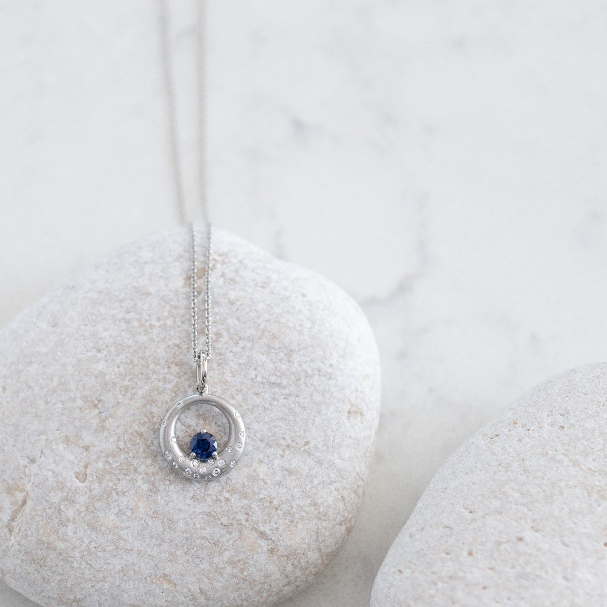 Part of our galaxy series, this effortless pendant features star-like diamonds and a bright blue sapphire.
