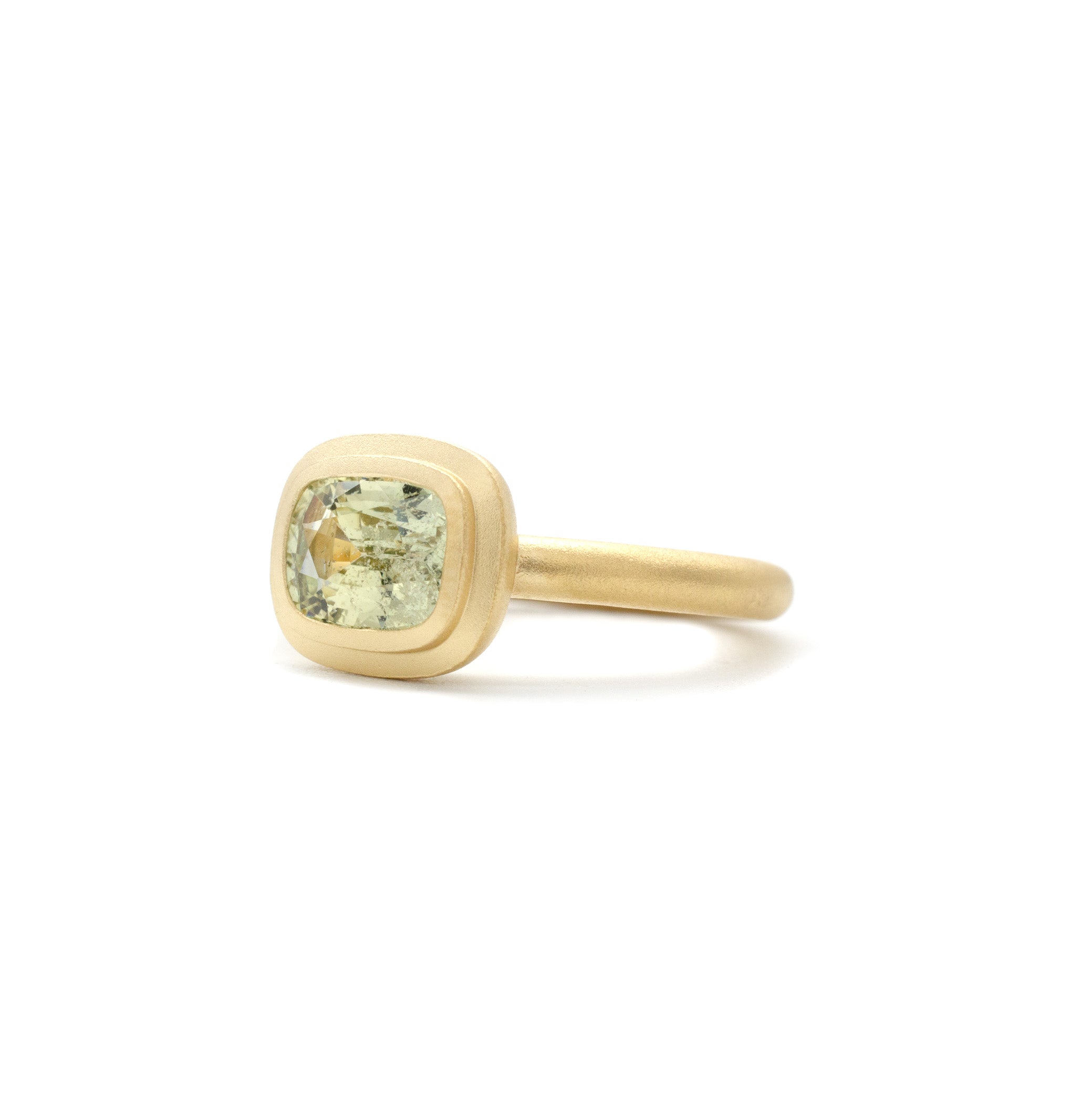 An unusual sapphire in an ethereal celadon tone ; somewhere between pale yellow, ice blue, grey, and light green, sets the mood for this singular piece. The stone is alive with crystalline, bubble-like inclusions, reminders of the slow eras-long process that shaped it deep within the earth. These natural features aren’t flaws; they’re the record of its creation, carrying a history written in pressure, heat, and time.