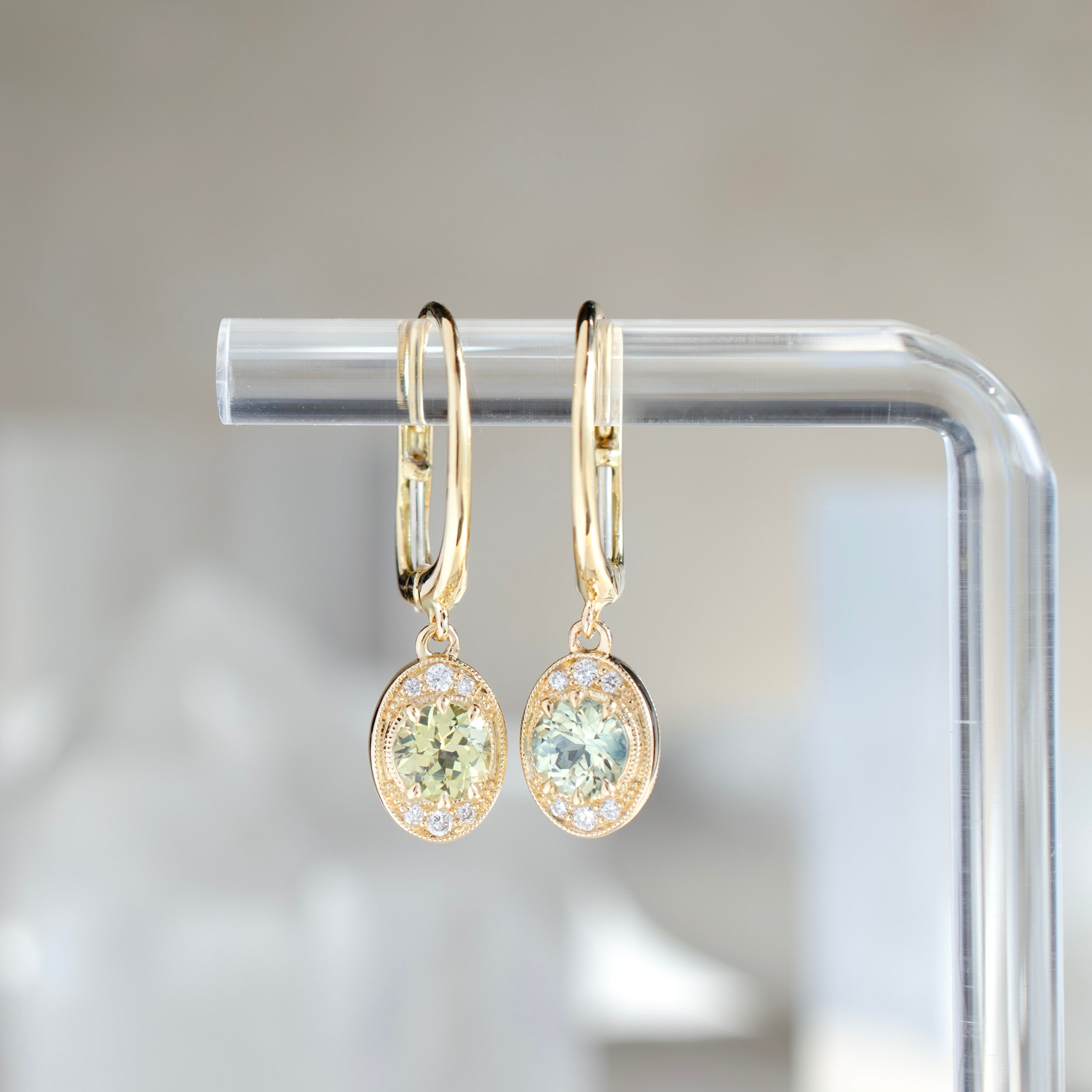 - .95 carats total of natural, unheated yellowish green sapphires