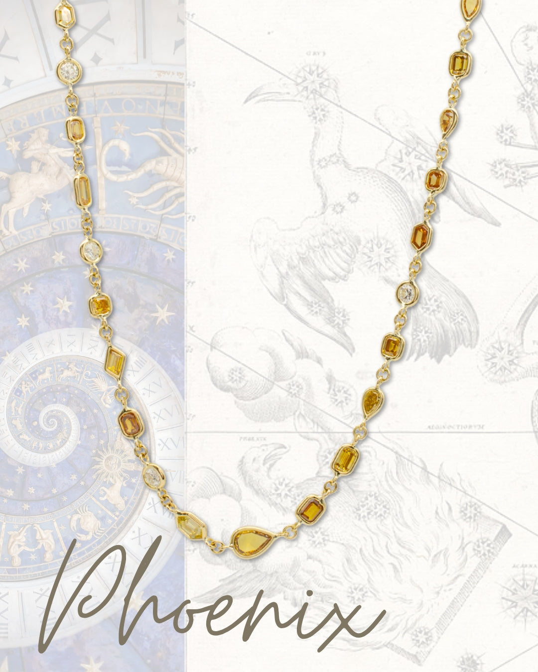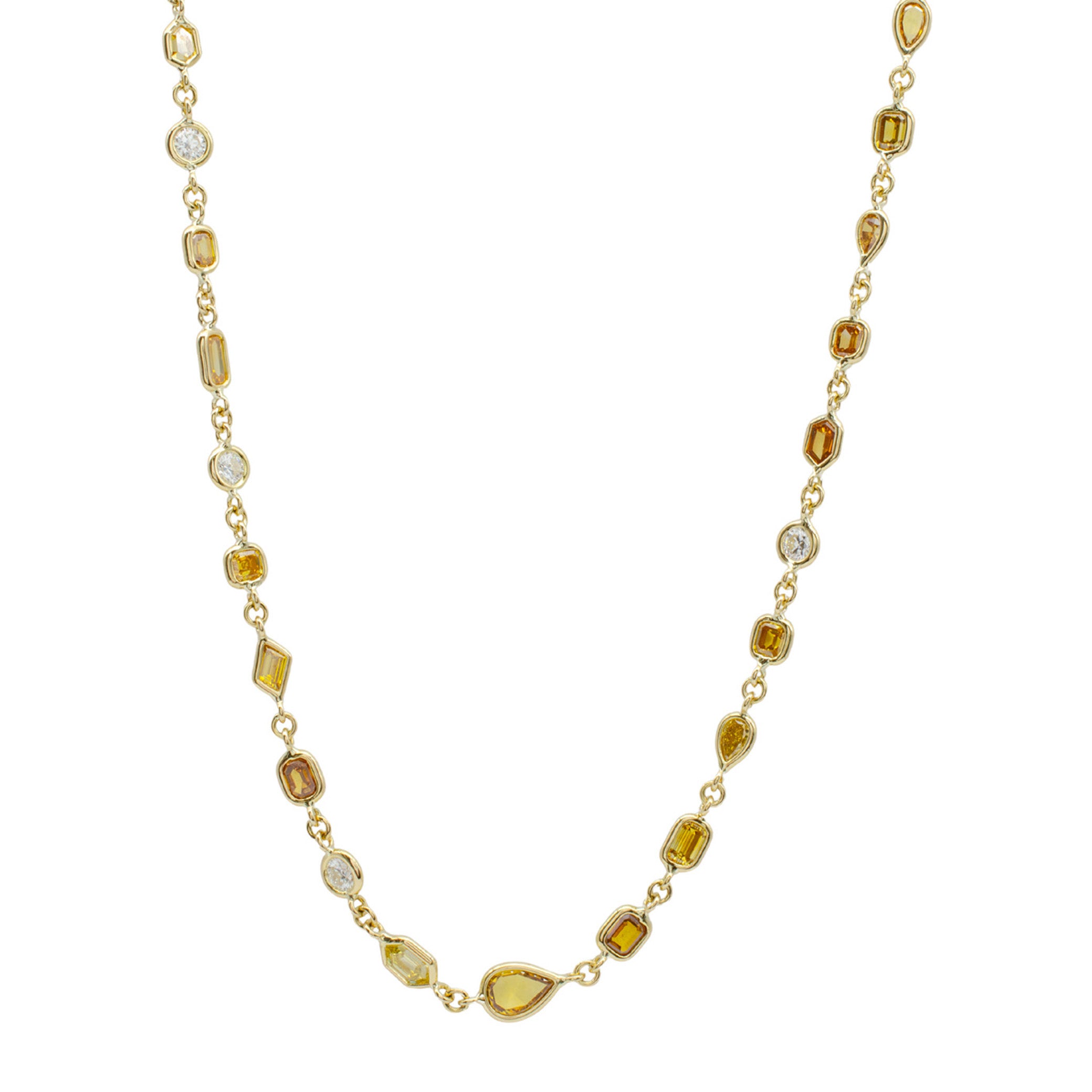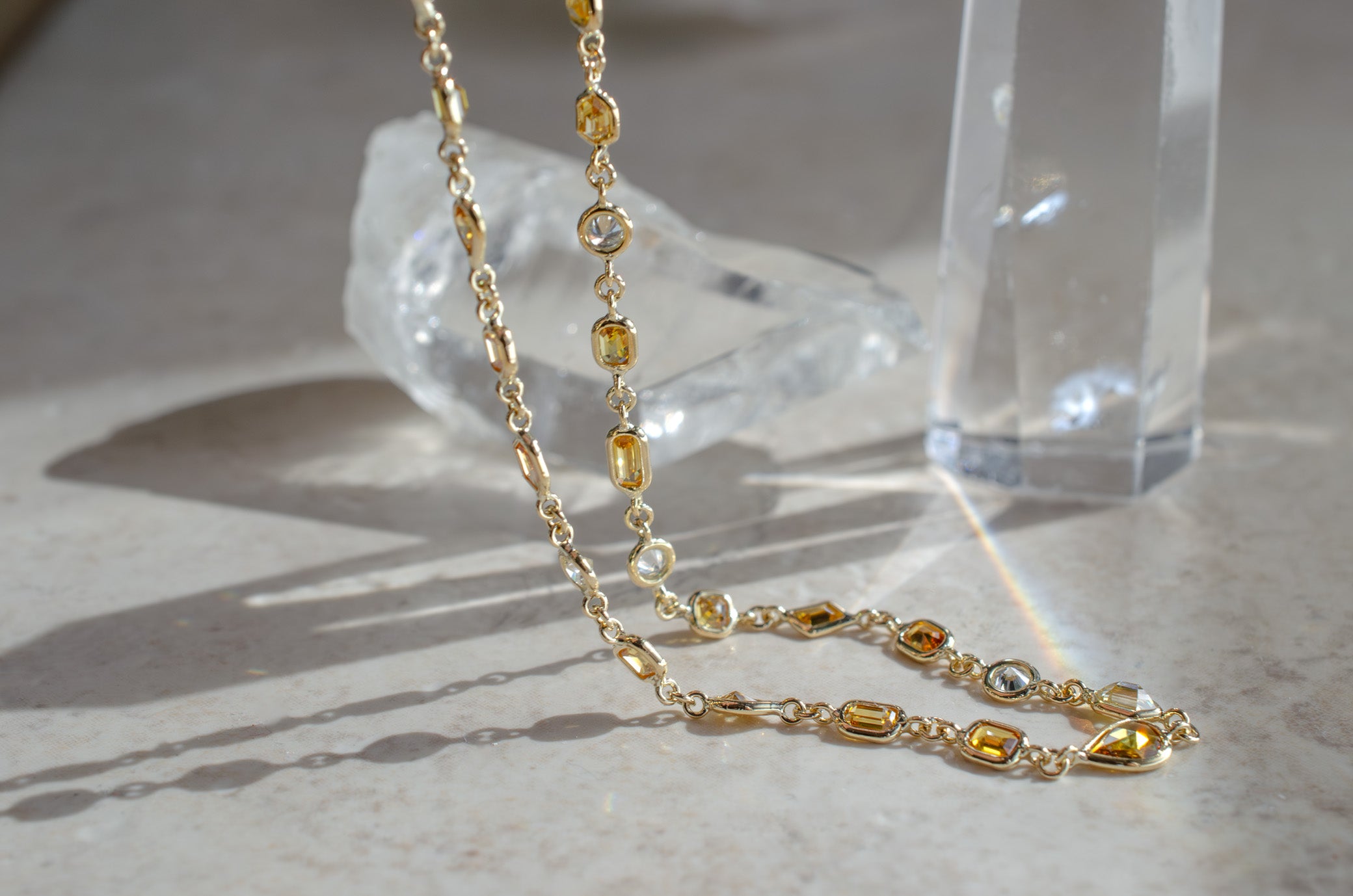 We began with the stones; an array of natural fancy yellow and vibrant orange diamonds, each cut into uncommon rhomboid forms, specimens that resist easy classification. Then we arranged them into a beautiful rhythm with accents of bright white brilliant cut diamonds.  Each stone was then wrapped by hand in 18k gold and linked one to the next, forming a line of color and glint that shifts with a subtle, mesmerizing cadence.