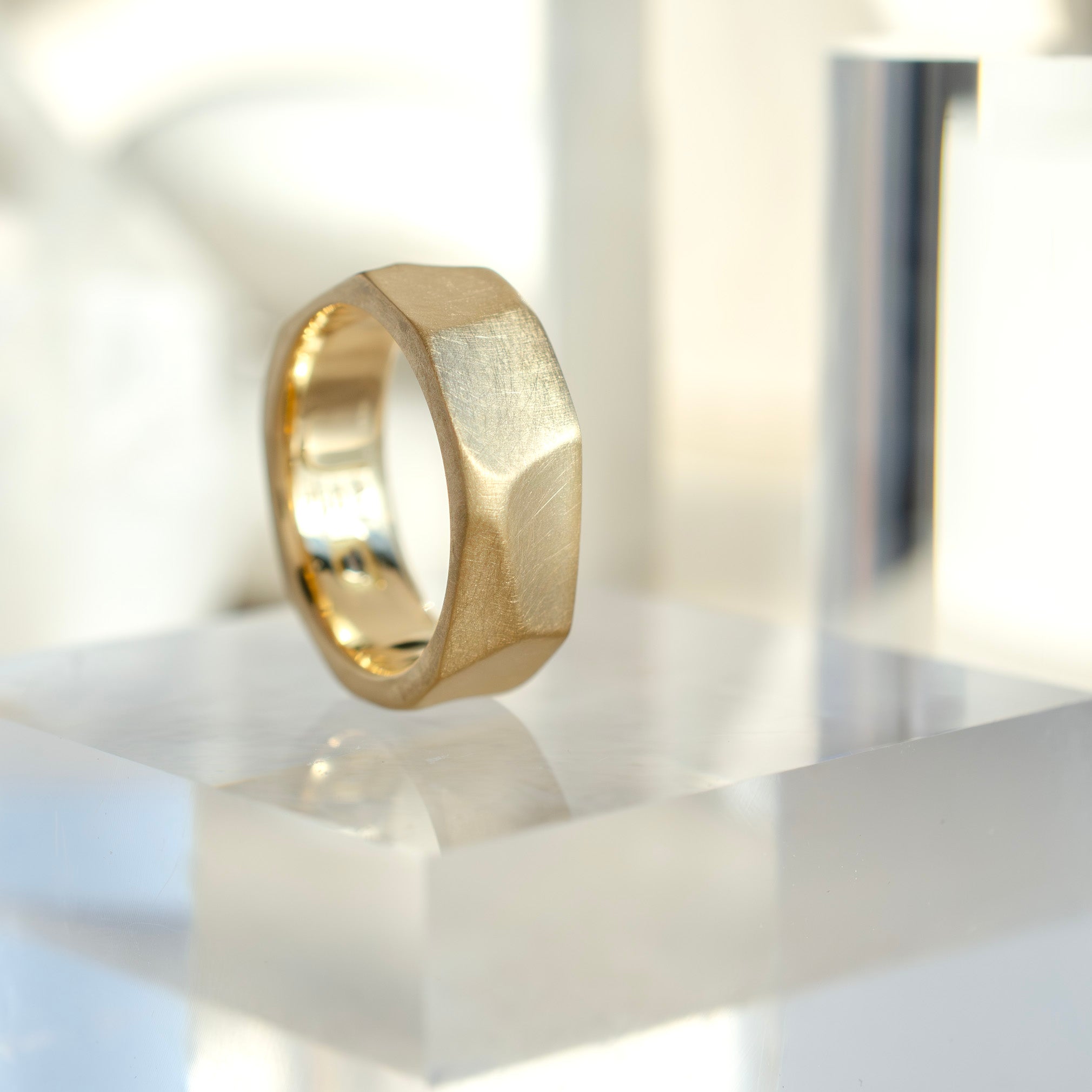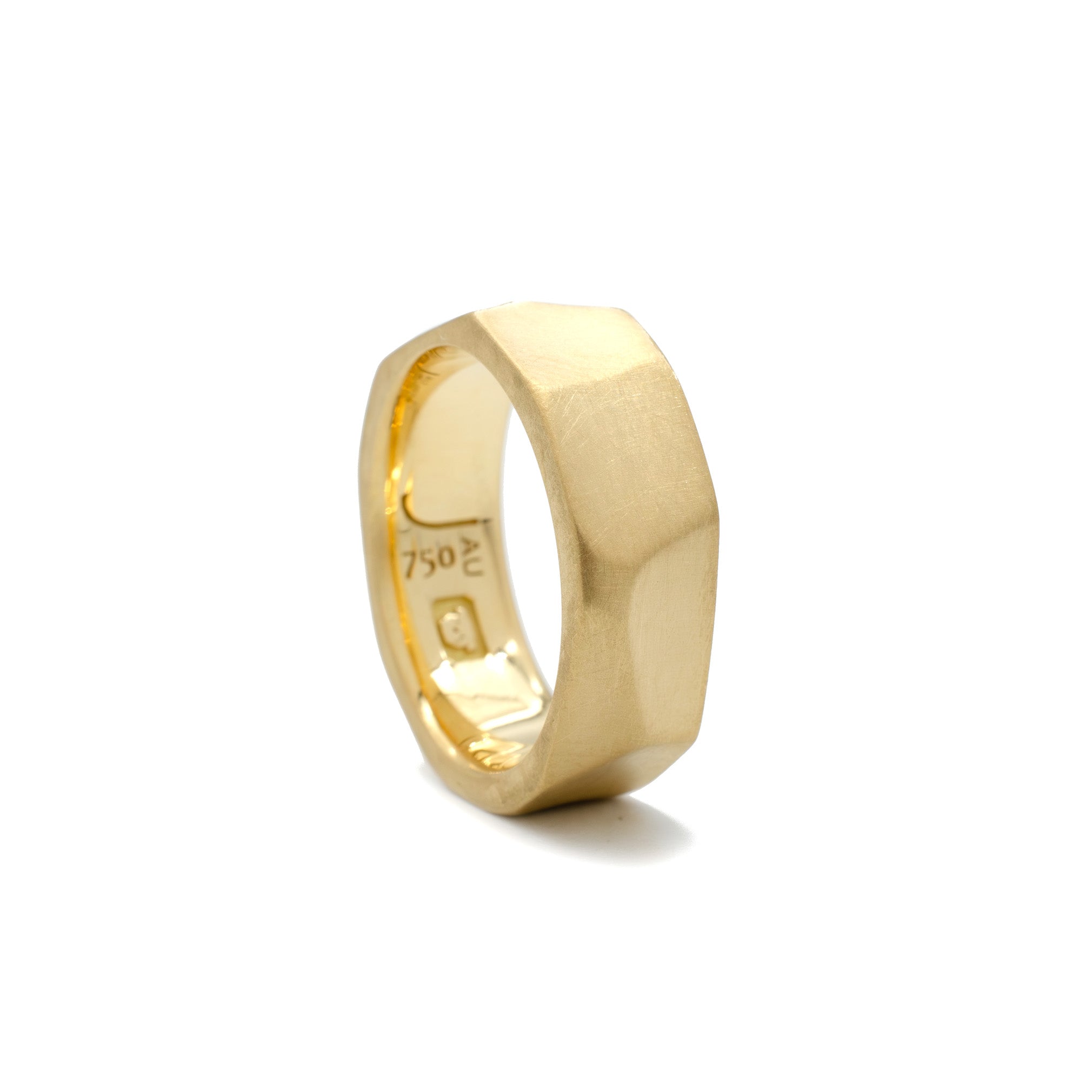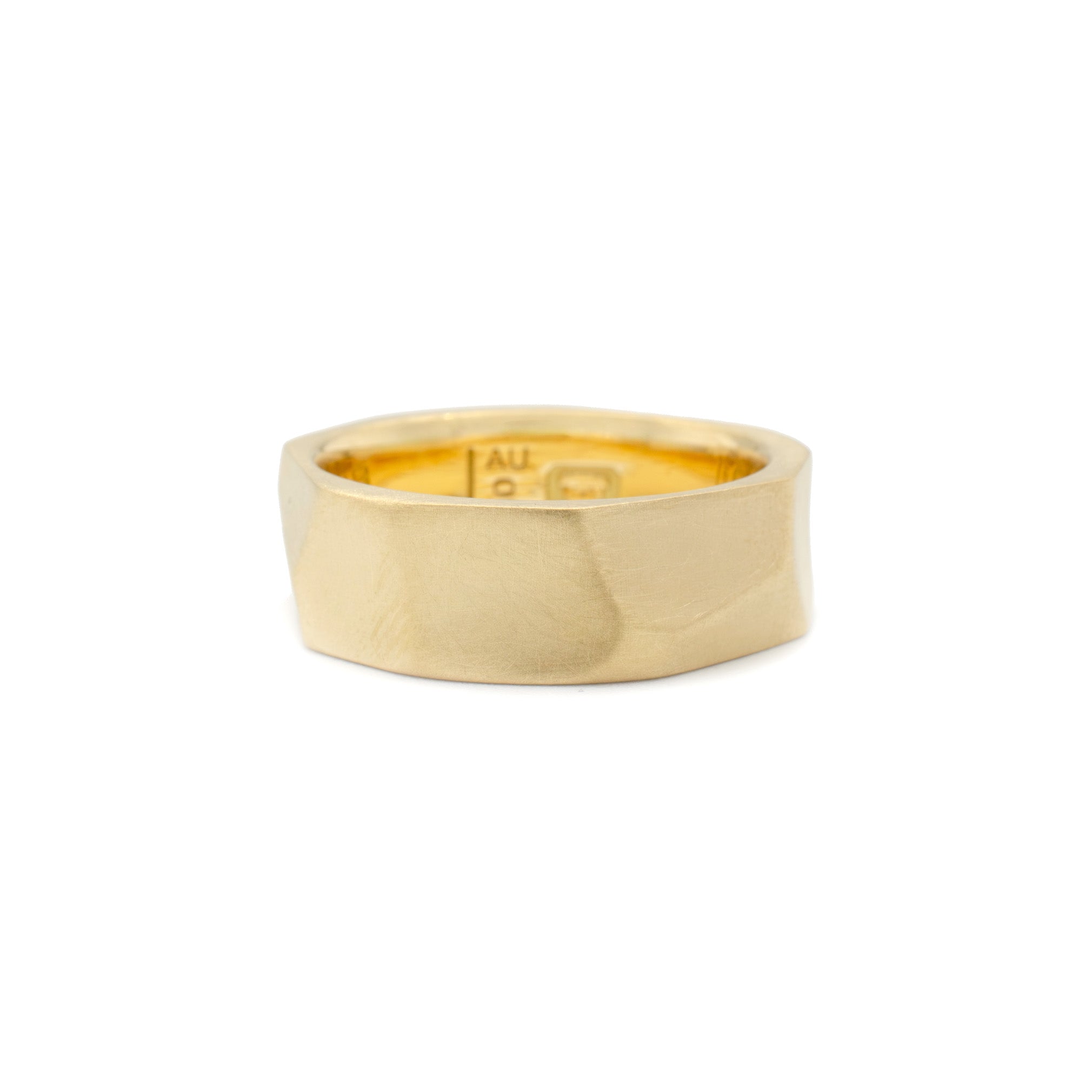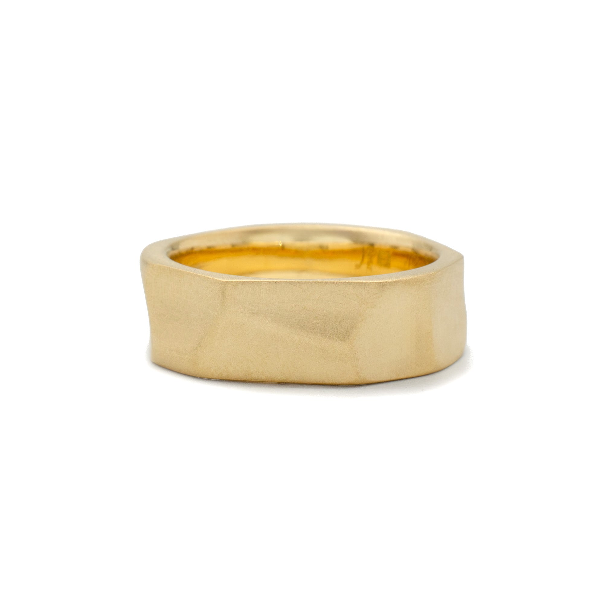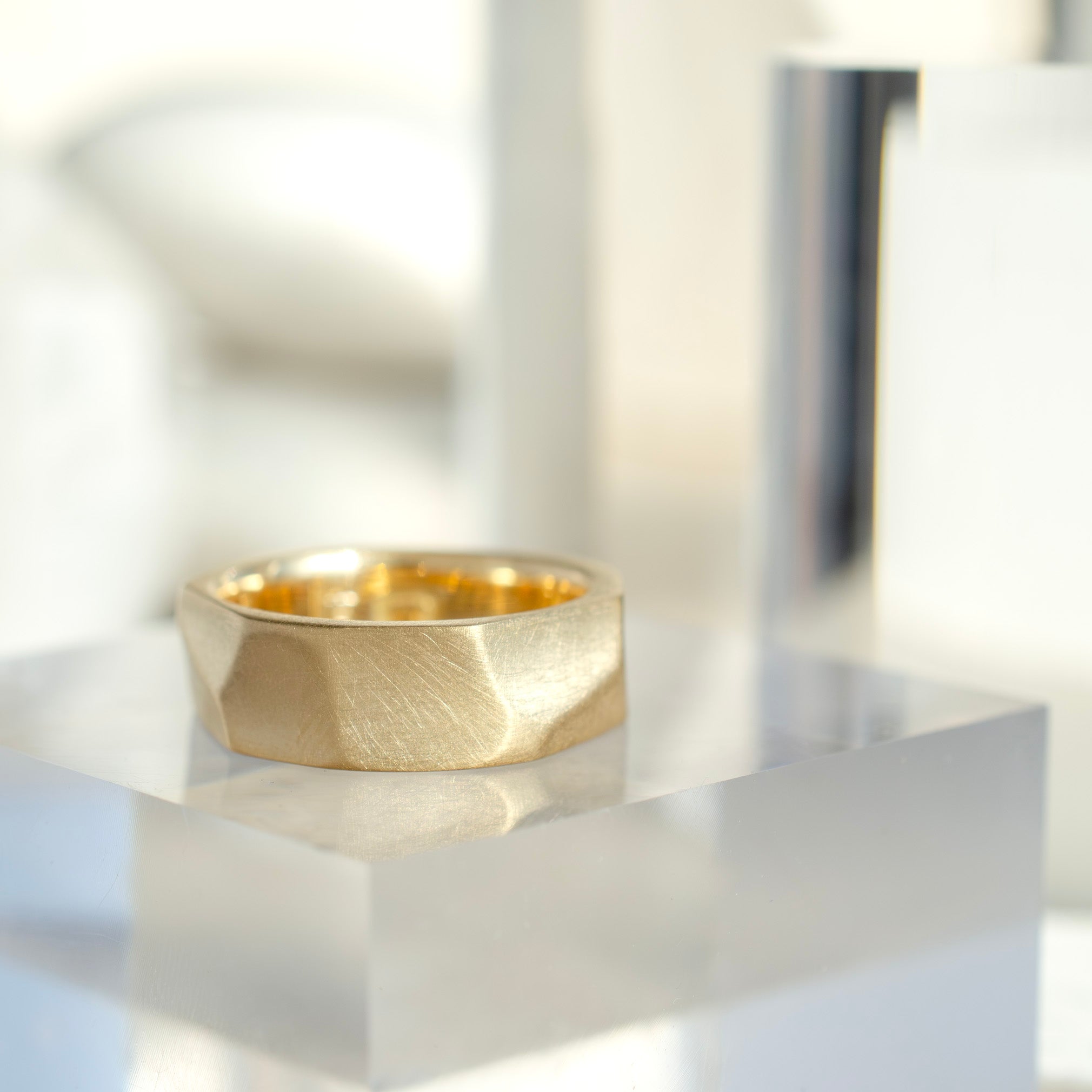 The Kelle is crafted in solid, hefty 18k gold, its form defined by broad, sculpted planes and softened, organic contours. The shape feels both deliberate and natural, the result of careful handwork and years of small refinements in our studio. Designed to endure, it carries a presence that speaks to permanence and lineage, the kind of piece that will be worn, marked by life, and eventually handed down. Inside, the heritage embossing detailing its maker, era, and metal, a symbolic and traditional record of origin that connects each generation to the last.