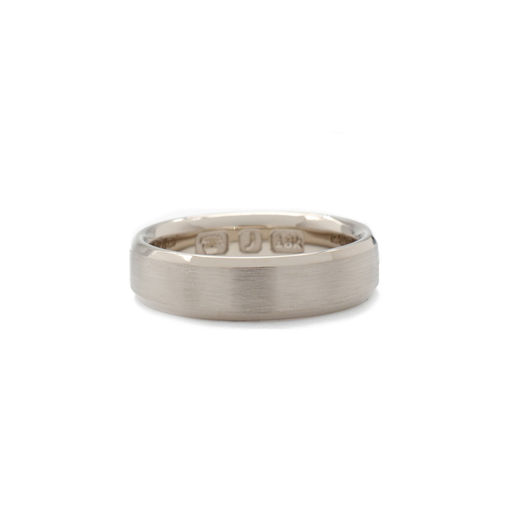 The Levy is made in solid 18k grey gold, with a brushed center and polished beveled edges. A meticulous and precise design with perfectly balanced proportions, emphasizing minimal, modern geometry. This ring pairs naturally with watches and other daily pieces, making it one of our most popular men's bands and an effortless companion as you move through life. Like all rings in the Men’s Heritage Ring Collection, it includes our specially contoured interior and embossed maker’s marks denoting designer, era, and metal.