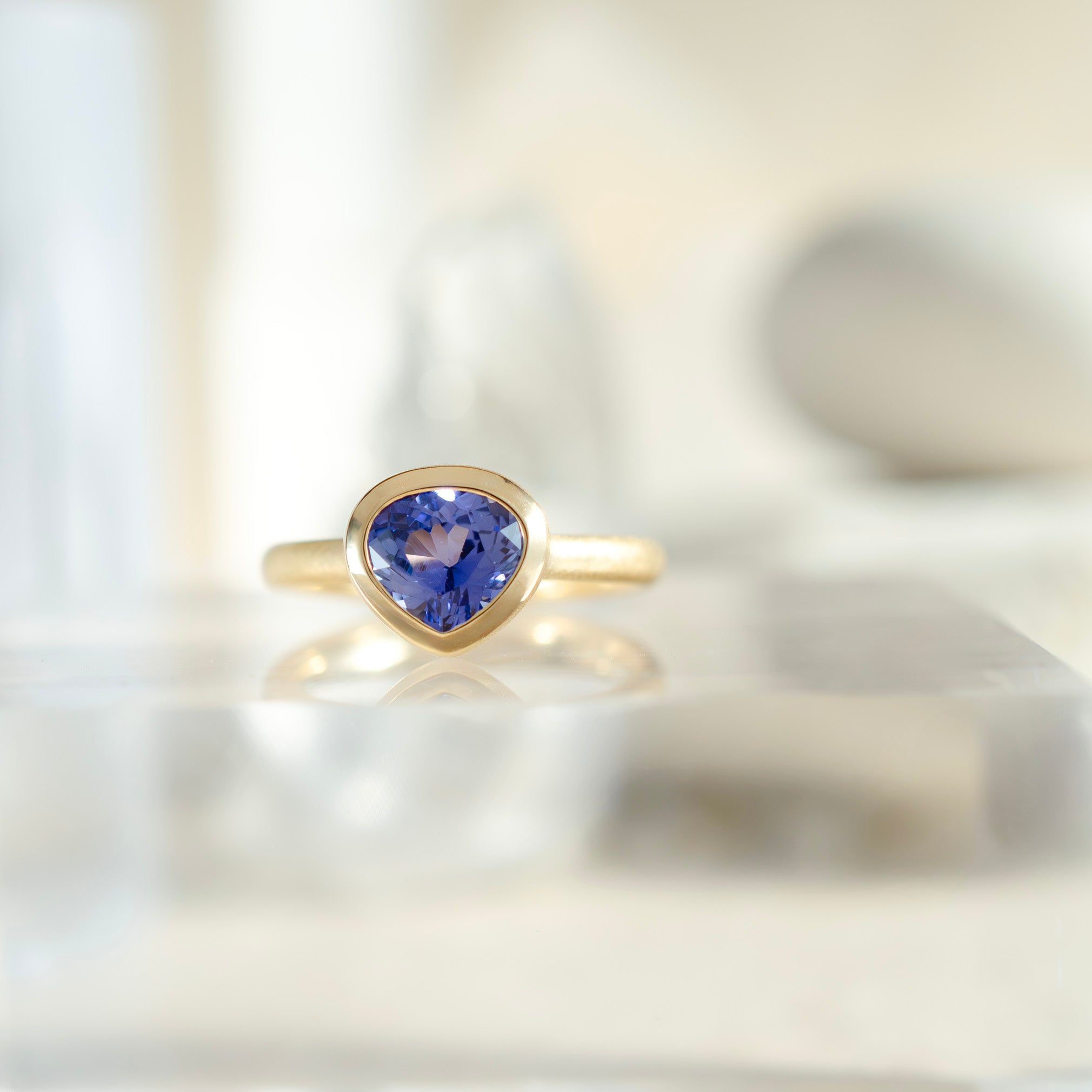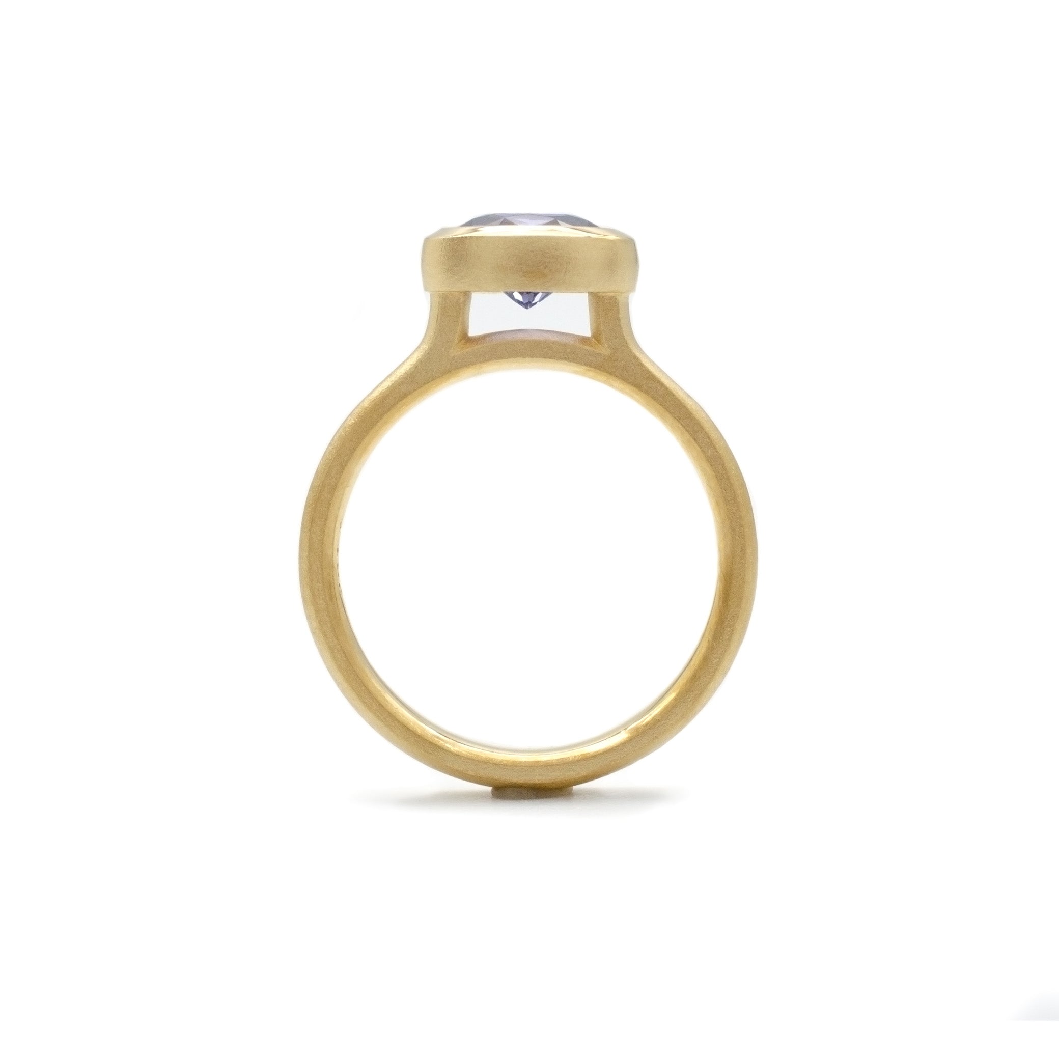A sister to our Kass Ring, the Cassie trades in her familial diamond shank for a more minimalist look... a simple and elegant solid gold bezel style ring with a patinaed finish and a mesmerizing blueish purple natural sapphire radiating at the center. One of a kind.