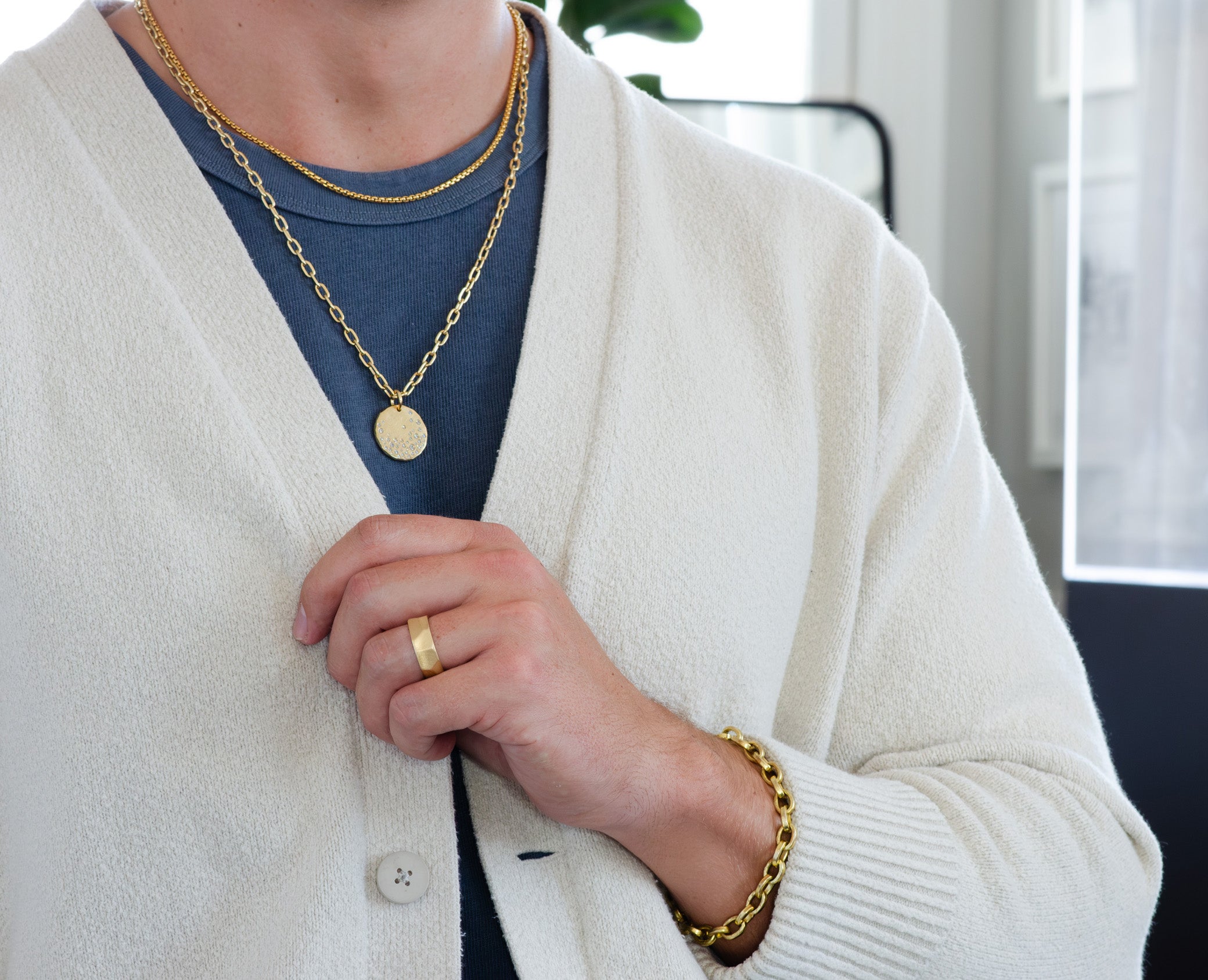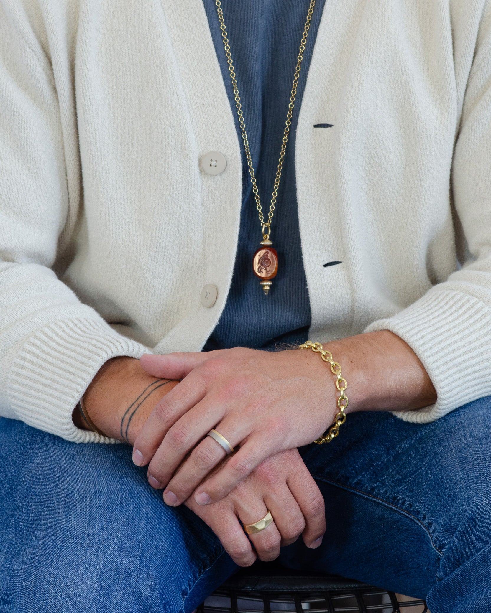 The Kelle is crafted in solid, hefty 18k gold, its form defined by broad, sculpted planes and softened, organic contours. The shape feels both deliberate and natural, the result of careful handwork and years of small refinements in our studio. Designed to endure, it carries a presence that speaks to permanence and lineage, the kind of piece that will be worn, marked by life, and eventually handed down. Inside, the heritage embossing detailing its maker, era, and metal, a symbolic and traditional record of origin that connects each generation to the last.