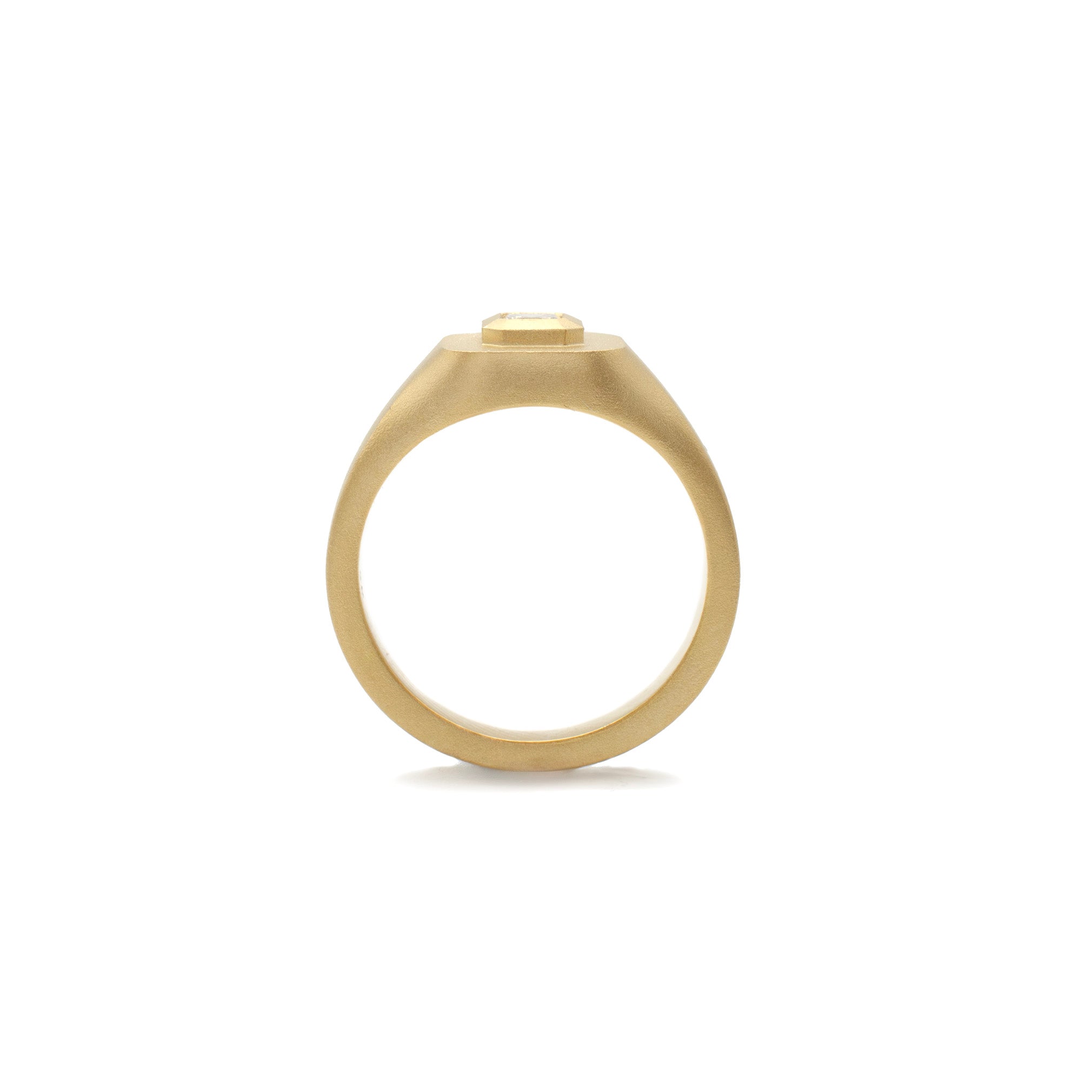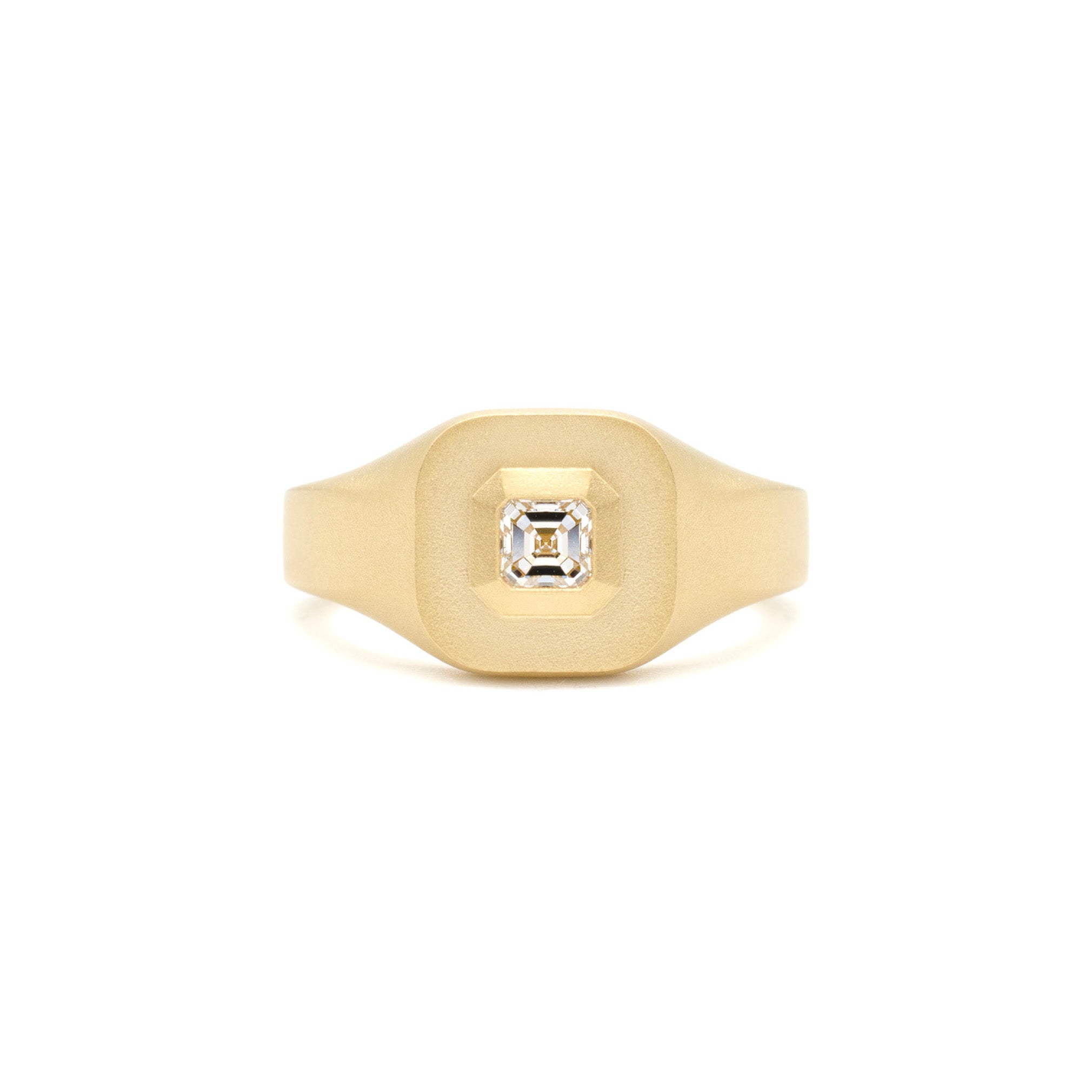 A refined reinterpretation of the classic signet, this ring combines strong geometry with subtle texture. Crafted in solid 18k gold with a satin finish, its soft surface plays against the precision and brilliance of a spectacular square emerald-cut diamond. A modern heirloom. A ring you're sure to be known for.