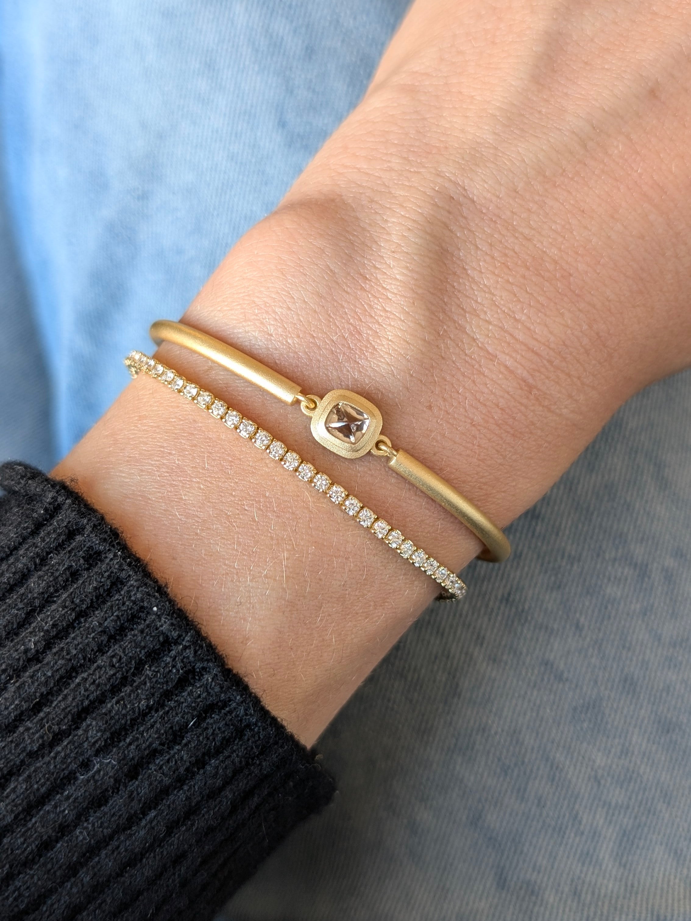 This bracelet is designed in house and handcrafted using an ethically sourced diamond & premium recycled gold.
