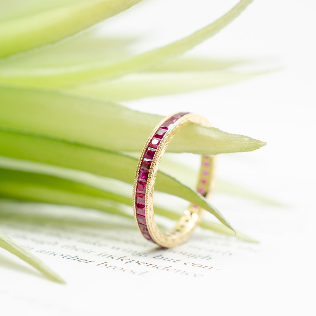 Eternity style band with a double row of hand milgrain and channel-set square rubies.